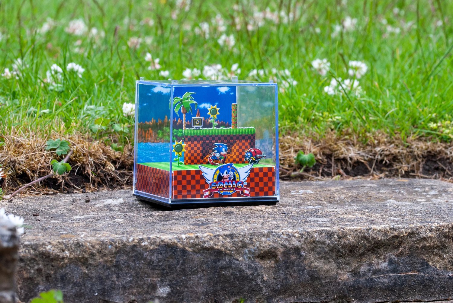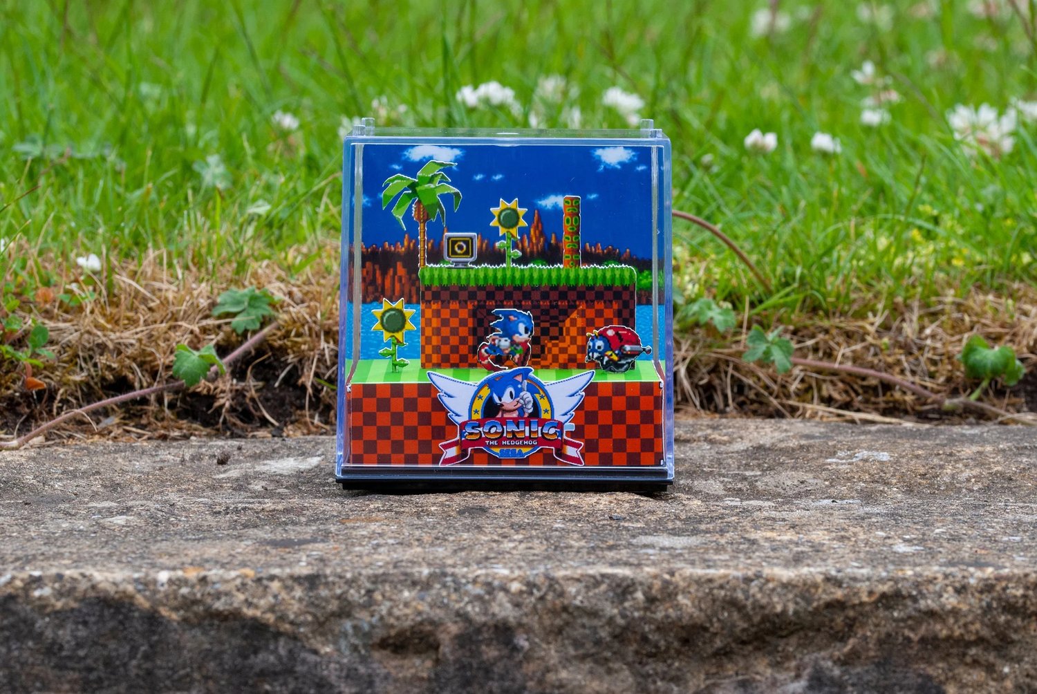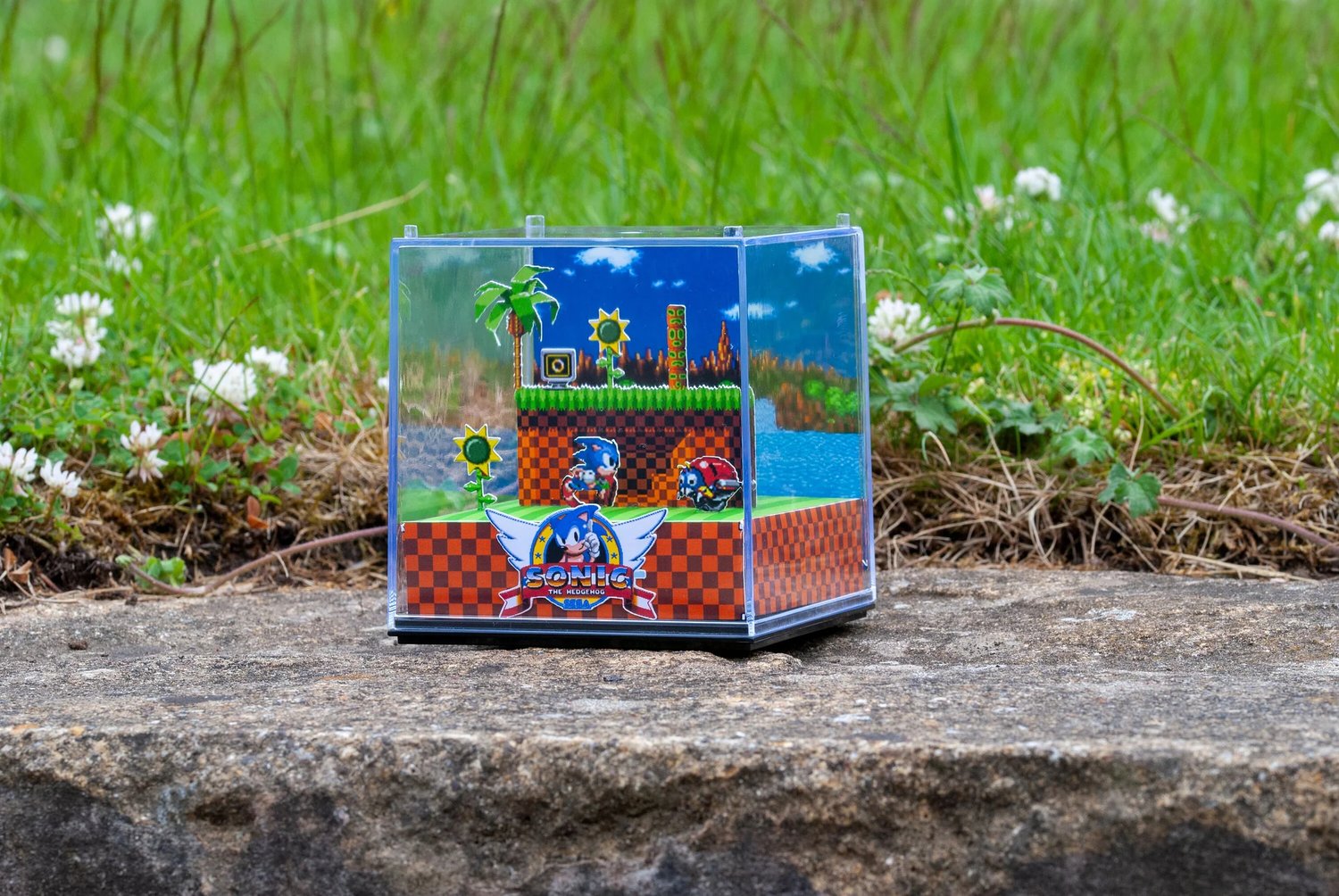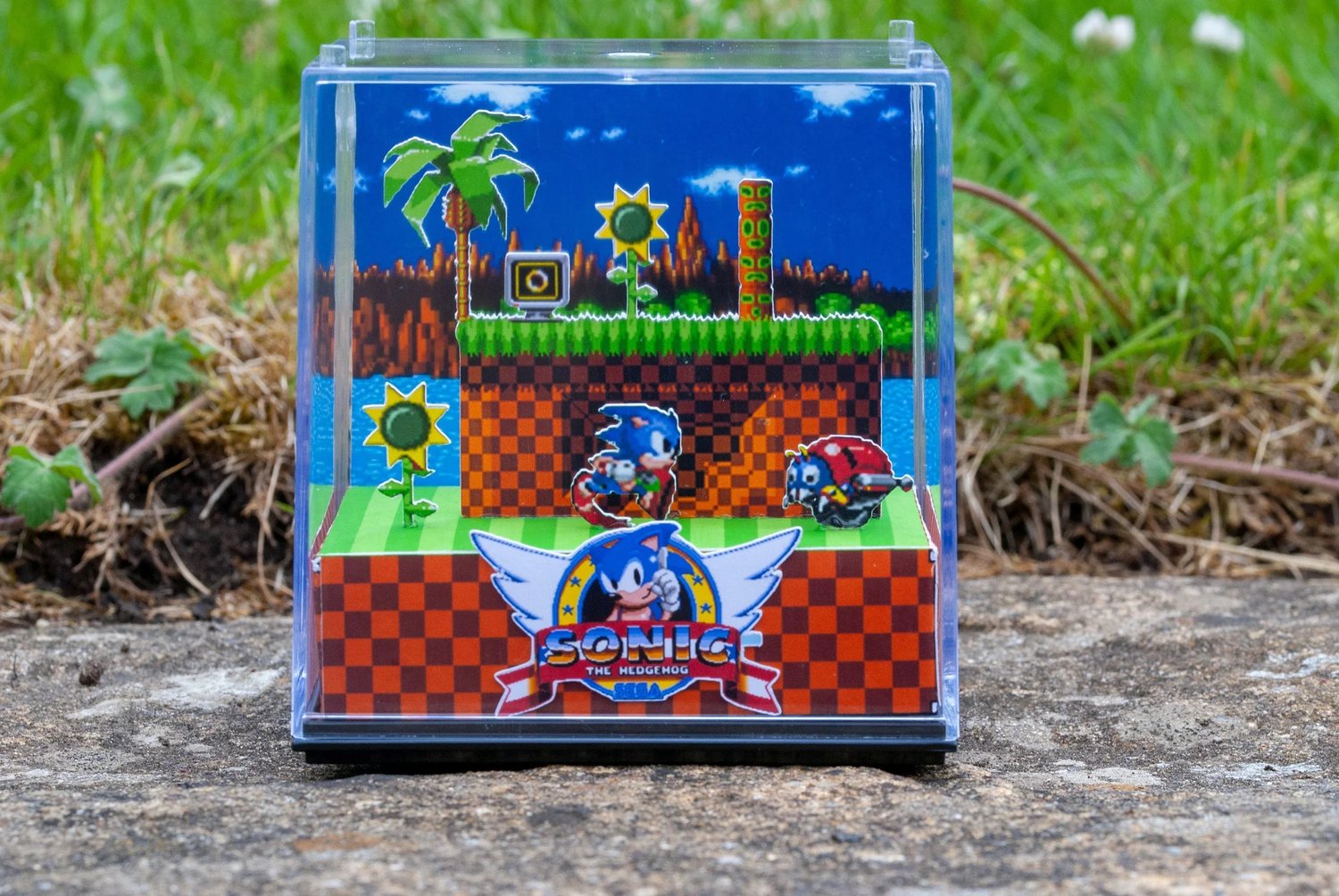 Decorate your home, gaming room or workspace with this nostalgic handmade 3D gamer cube diorama featuring Green Hill Zone from Sonic The Hedgehog!
